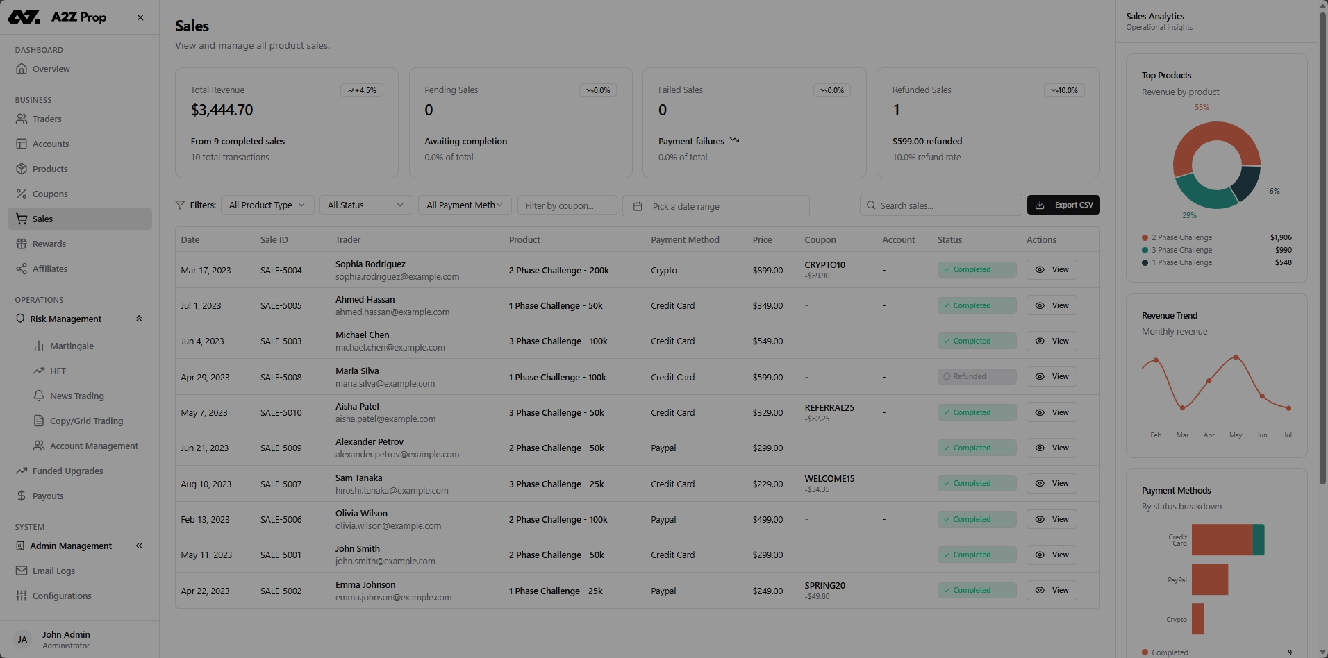 The complete back-office for proprietary trading firms. Manage traders, challenges, risk, payouts, and sales from a single admin dashboard. Your traders get a marketplace, leaderboard, and self-service portal.